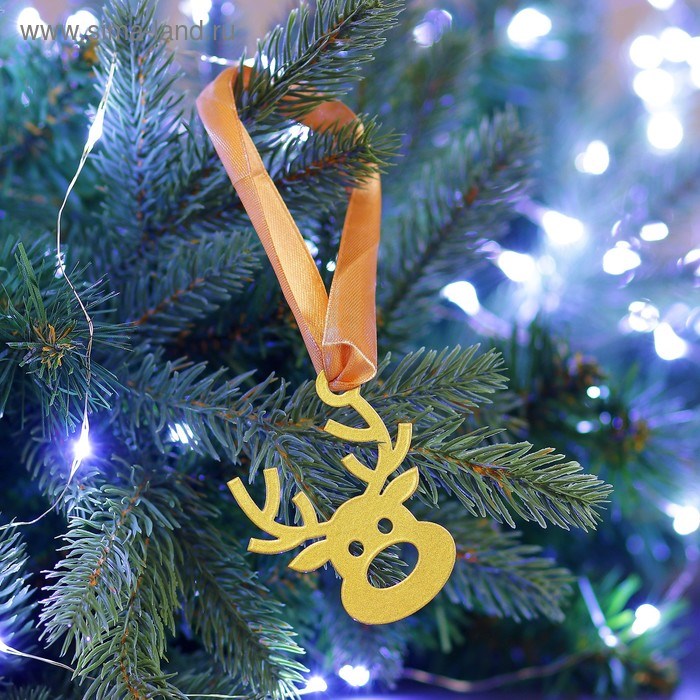 Елочная подвеска металлическая с лентой Олень Рудольф 7см золотая 3865237