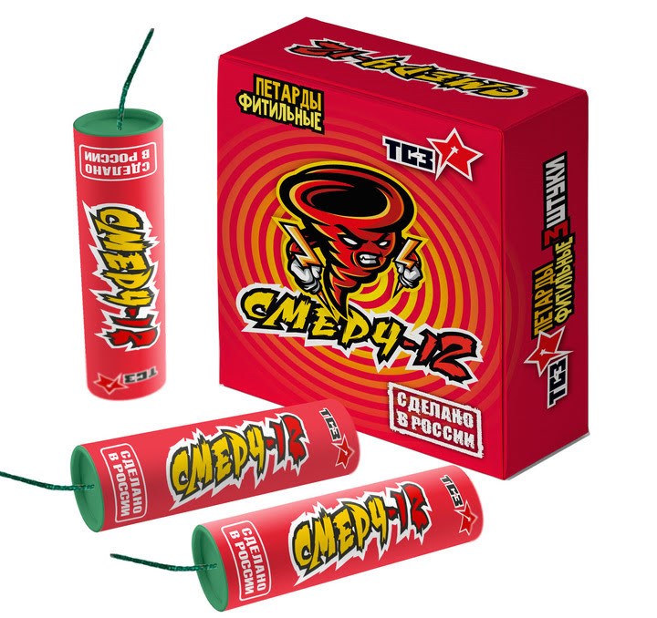 Данный вид петард является примером настоящего импортозамещения: наконец-то российские пиротехнические предприятия освоили производство не только бенгальских свечей и хлопушек, но и мощных петард! Петарды под маркой Смерч производят на Троицком Снаряжательном Заводе (г. Сергиев Посад, Московская обл.) Внешне они довольно сильно отличаются от всем привычных китайских петард. В первую очередь корпусом. Он необычно твердый и окрашен в яркий цвет, в целом петарда выглядит необычно и напоминает ... хлопушки! Однако такая ассоциация не должна вводить в заблуждение: это совсем не детские игрушки. Петарда взрывается с оглушительным грохотом, она очень мощная. Петарды расфасованы в коробки по 3 штуки.