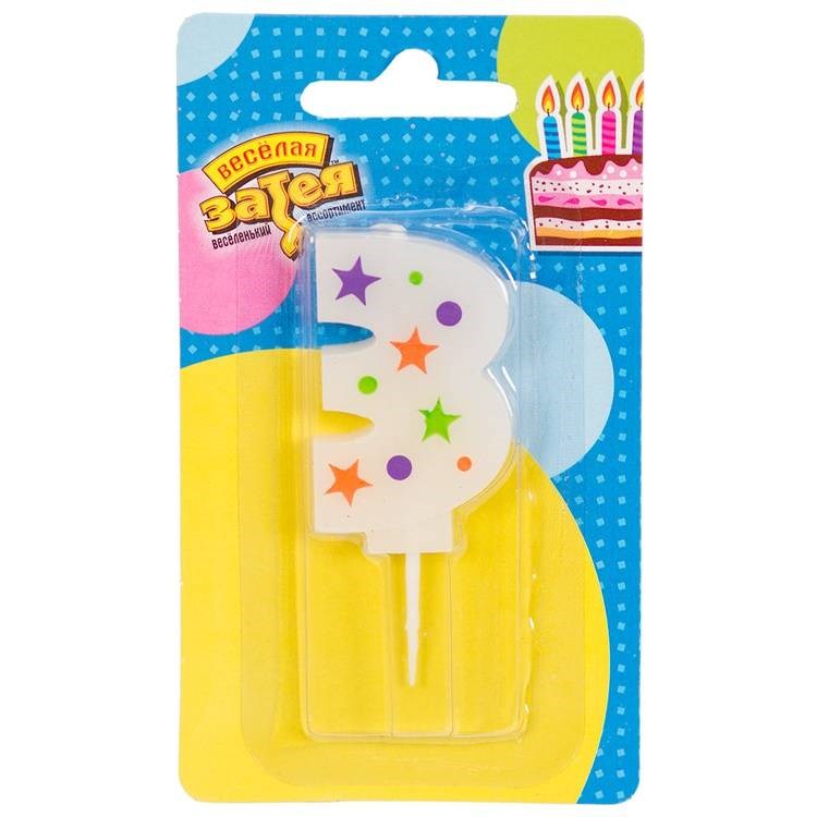 Декоративное украшение стола. Свеча-мини на пике в форме цифры "3", белого цвета, с красивым цветным принтом Звезды. Отличное решение для декорирования торта, десерта ко дню рождения или юбилею. Стеарин, оригинальный дизайн. Высота свечи-цифры 5 см.