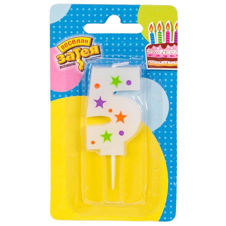 Декоративное украшение стола. Свеча-мини на пике в форме цифры "5", белого цвета, с красивым цветным принтом Звезды. Отличное решение для декорирования торта, десерта ко дню рождения или юбилею. Стеарин, оригинальный дизайн. Высота свечи-цифры 5 см.