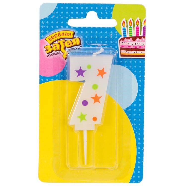 Декоративное украшение стола. Свеча-мини на пике в форме цифры "7", белого цвета, с красивым цветным принтом Звезды. Отличное решение для декорирования торта, десерта ко дню рождения или юбилею. Стеарин, оригинальный дизайн. Высота свечи-цифры 5 см.