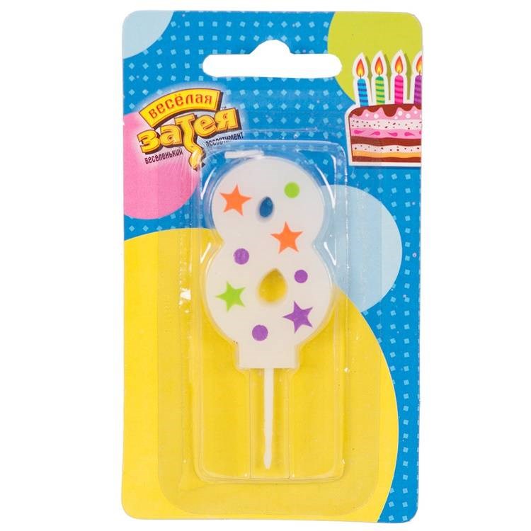 Декоративное украшение стола. Свеча-мини на пике в форме цифры "8", белого цвета, с красивым цветным принтом Звезды. Отличное решение для декорирования торта, десерта ко дню рождения или юбилею. Стеарин, оригинальный дизайн. Высота свечи-цифры 5 см.