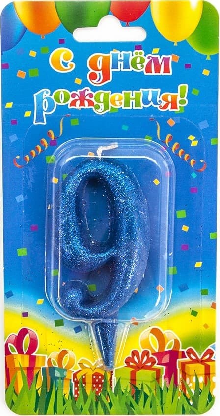 Свеча Цифра 9 Овал Синий с блестками 8см