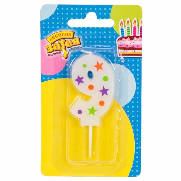 Декоративное украшение стола. Свеча-мини на пике в форме цифры "9", белого цвета, с красивым цветным принтом Звезды. Отличное решение для декорирования торта, десерта ко дню рождения или юбилею. Стеарин, оригинальный дизайн. Высота свечи-цифры 5 см.